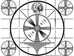 As Collier's kangaroo trial comes on air, the television set briefly features the classic Indian-head test pattern. This image was used on television stations from the late 1940's until television stations began to broadcast 24 hours a day in the 1960s and 70s. It appeared following the end of a station's nightly program and the national anthem, while the station was still transmitting. It would reappear in the morning when the station began transmitting, but before it signed on and began its morning programming.