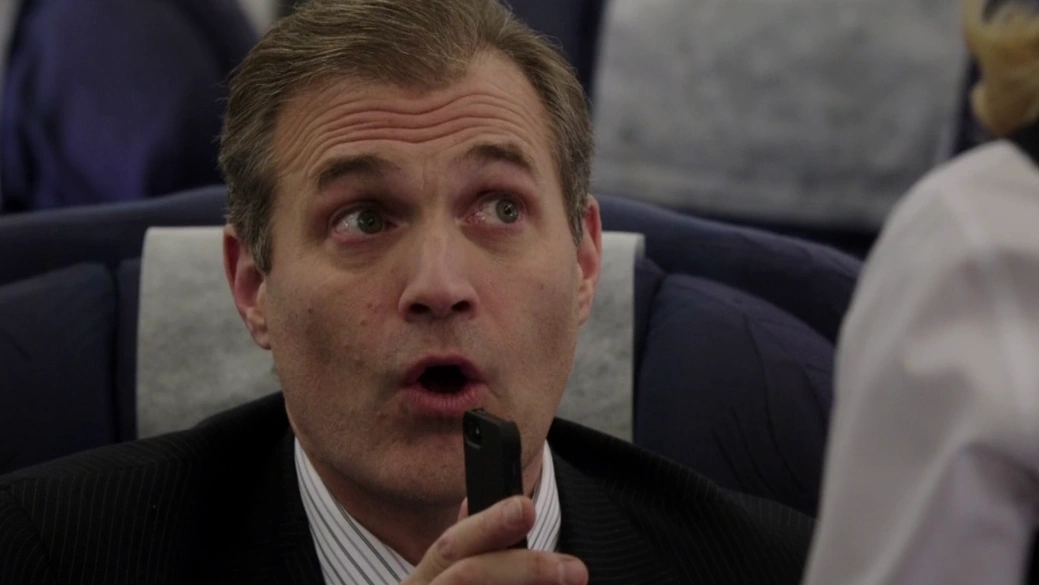 He is first seen on the phone, and putting a bag in the overhead compartment ahead of an elderly lady. Reese, trying to help her place her baggage is chastised by him. "Hey, that's my Tumi that your'e sliding over. Try not to smash it." And Reese's response to the man was to slam the bag he was holding against that bag, breaking the item inside. The businessman was talking on his phone during the plane's takeoff and was requested by Holly, the hostess, to turn it off. He rudely refused and when Carlos, another flight attendant, refused to help, Reese knocked out the businessman and took his phone.